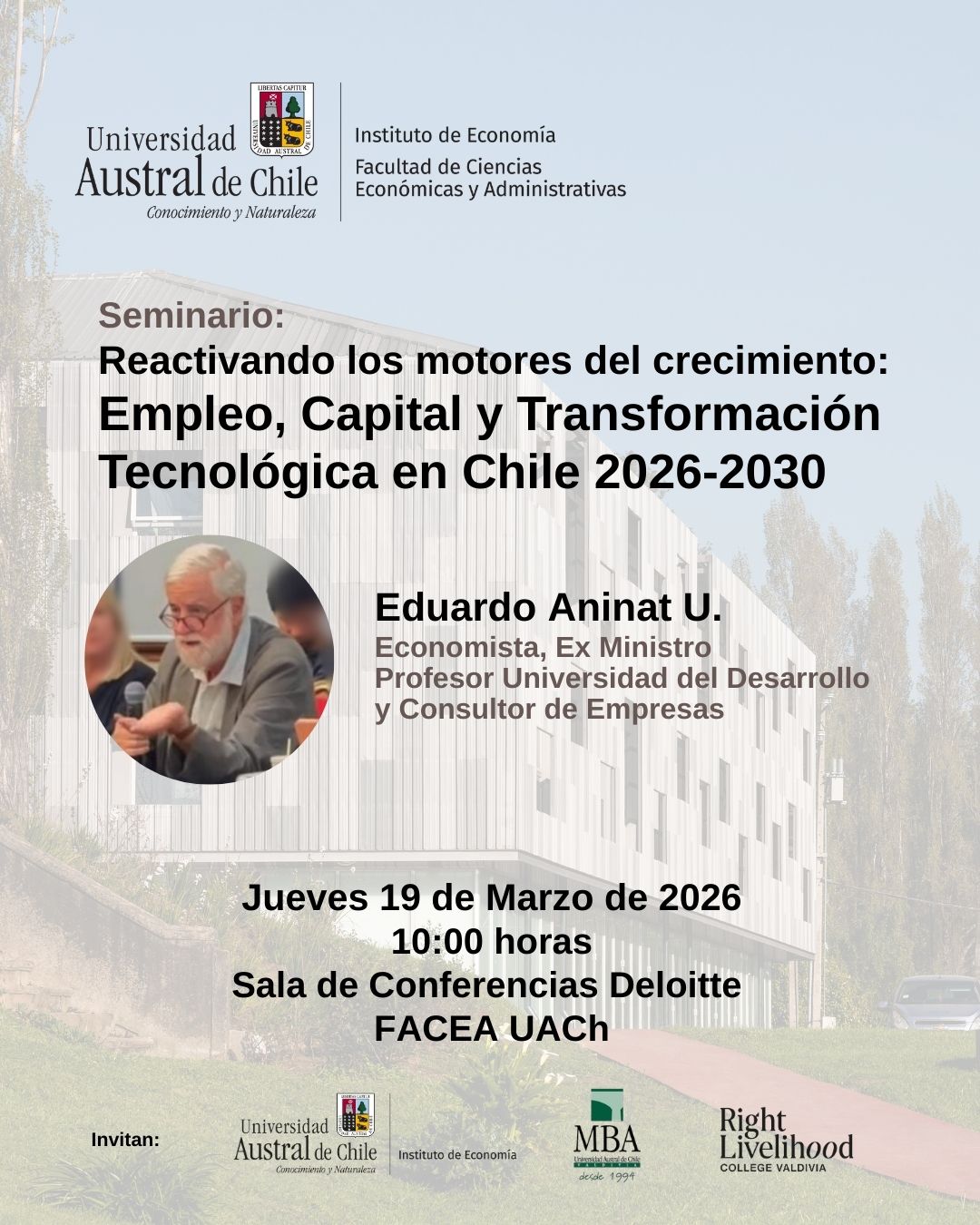 16. Dr. Eduardo Aninat U, exministro de Hacienda, “Reactivando los Motores del Crecimiento: Empleo, Capital y Transformación Tecnológica en Chile 2026–2030”, Valdivia, 19.03.2026. Ver poster. Ver nota de prensa UACh. Ver nota de prensa UACh 2. Ver diario Austral.